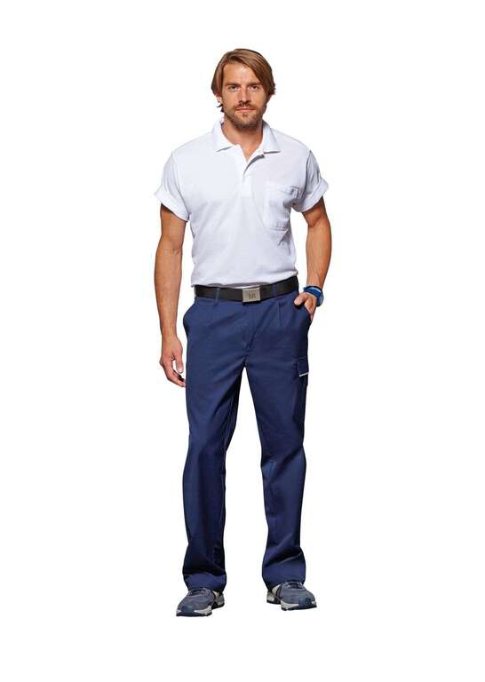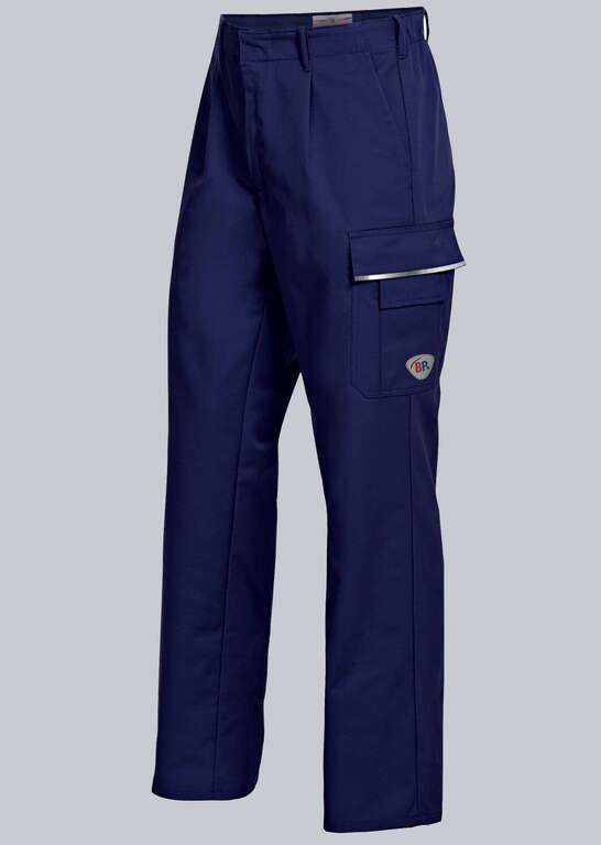 Gummizug im Rücken, Bundfalten, 2 Seitentaschen, Schlitzreißverschluss, Zollstocktasche, 1 mit Patte verschließbare Schenkeltasche mit aufgesetzter Handytasche, 1 verschließbare Gesäßtasche, reflektierende Paspeln schonend zu Oberflächen durch verdeckte Metallteile bequemer Bund mit Gummizug funktionale Taschen, seitlicher Reflexstreifen normale Passform