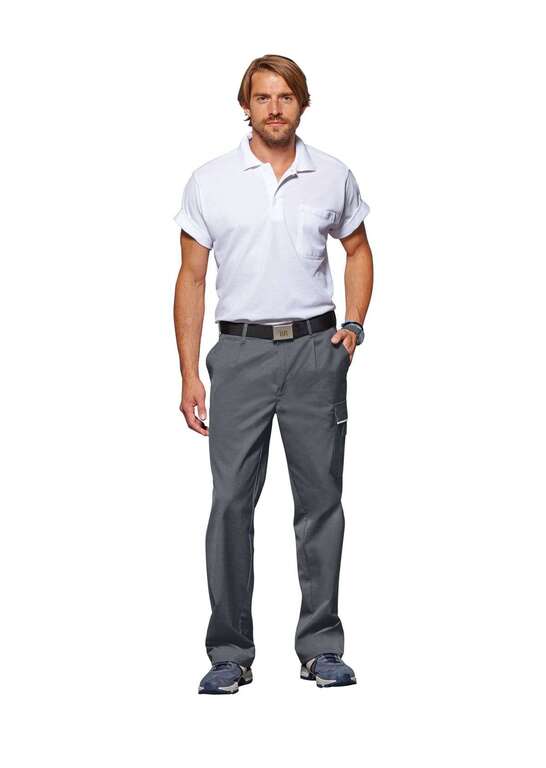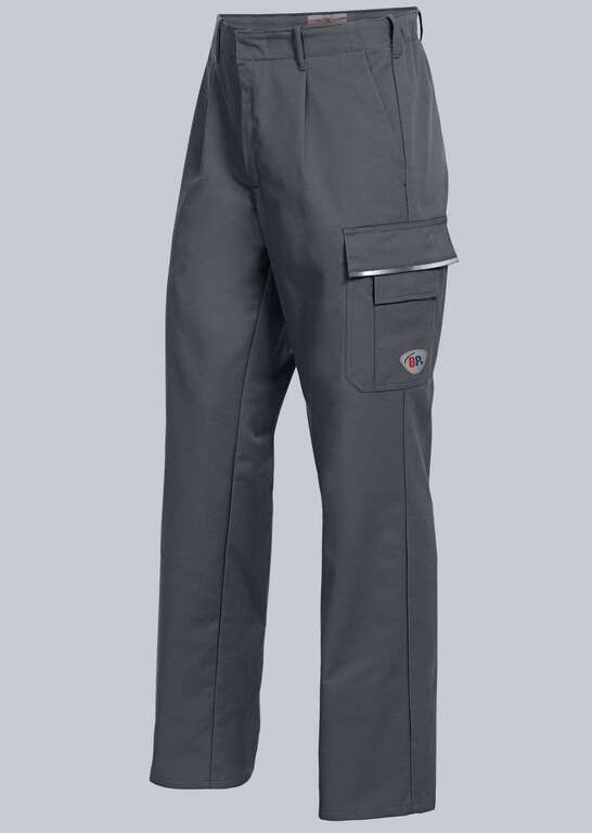Gummizug im Rücken, Bundfalten, 2 Seitentaschen, Schlitzreißverschluss, Zollstocktasche, 1 mit Patte verschließbare Schenkeltasche mit aufgesetzter Handy-Tasche, 1 verschließbare Gesäßtasche, reflektierende Paspeln schonend zu Oberflächen durch verdeckte Metallteile bequemer Bund mit Gummizug funktionale Taschen, seitlicher Reflexstreifen normale Passform