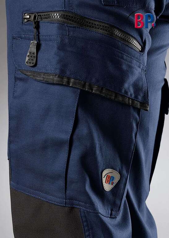 Erhöhter Dehnbund im Rücken für optimalen Sitz, D-Ring zum Befestigen von Accessoires, 2 Seitentaschen, 2 mit Patte und Drucker verschließbare Gesäßtaschen, 2 mit Patte und Drucker verschließbare Schenkeltaschen, 1 innenliegende Schenkeltasche mit Reißverschluss, Zollstocktasche, strapazierfähiger Besatz am Knie, ergonomischer Schnitt erhöhter rückwärtiger Bund für optimalen Sitz Robuste Stretch-Verstärkung am Knie besonders leichtes Gewebe schmale-ergonomische Passform