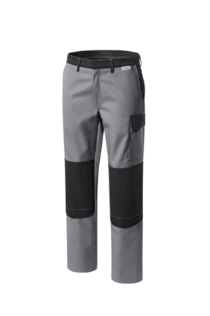Zweifarbige Bundhose mit zwei Seitentaschen, Knietaschen, Schenkeltaschen mit aufgesetzter 4-facher Stifttasche links, Zollstocktasche mit aufgesetzter Handytasche mit farblich abgesetzter Patte und Klettverschluss rechts, zwei Gesäßtaschen, rechts mit farblich abgesetzter Patte und Druckverschluss, Hammerschlaufe, Schlitz mit Reißverschluss