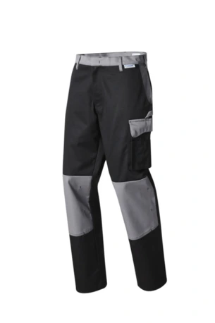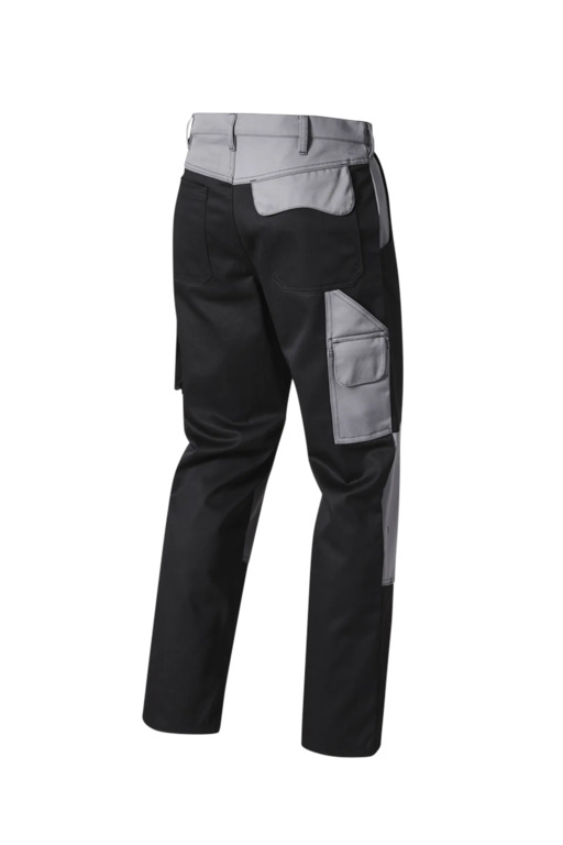 Zweifarbige Bundhose mit zwei Seitentaschen, Knietaschen, Schenkeltaschen mit aufgesetzter 4-facher Stifttasche links, Zollstocktasche mit aufgesetzter Handytasche mit farblich abgesetzter Patte und Klettverschluss rechts, zwei Gesäßtaschen, rechts mit farblich abgesetzter Patte und Druckverschluss, Hammerschlaufe, Schlitz mit Reißverschluss