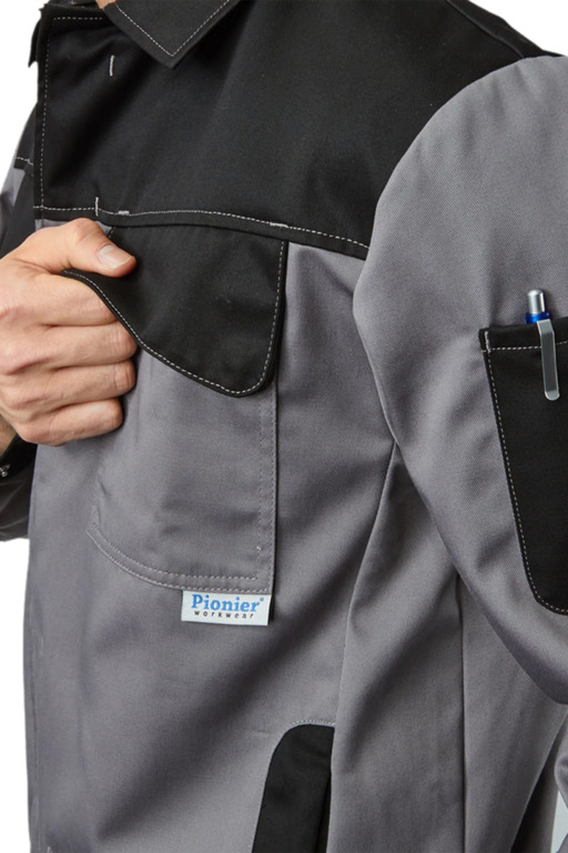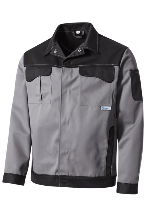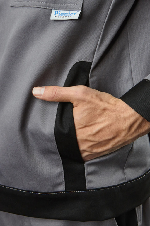 Zweifarbige Bundjacke mit Umlegekragen, verdeckte Druckknopfleiste, zwei Brusttaschen mit Patte und verdecktem Druckknopfverschluss, rechts mit Handytasche inkl. Klettverschluss, eine Ärmeltasche links unterteilt in zwei Stifttaschen, zwei eingesetzte Seitentaschen, Ärmelbündchen mit verdecktem verstellbaren Druckknopfverschluss