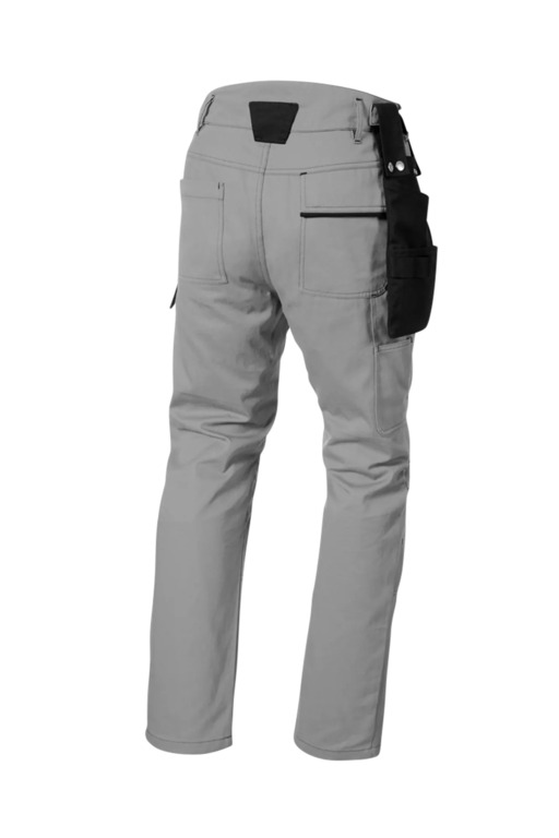 Bundhose mit Knietaschen, zwei eingesetzte Seitentaschen, Zollstocktasche, zwei Gesäßtaschen, rechts mit Patte, eine Cargotasche, Schlitz mit Metallreißverschluss, Hosenbund mit innenliegendem Knopf verschließbar, Laschen für separate Flexi-Pocket, Kontrastelemente in Schwarz an den Gürtelschlaufen, Innenbund, Tascheneingriffen und den Patten
