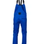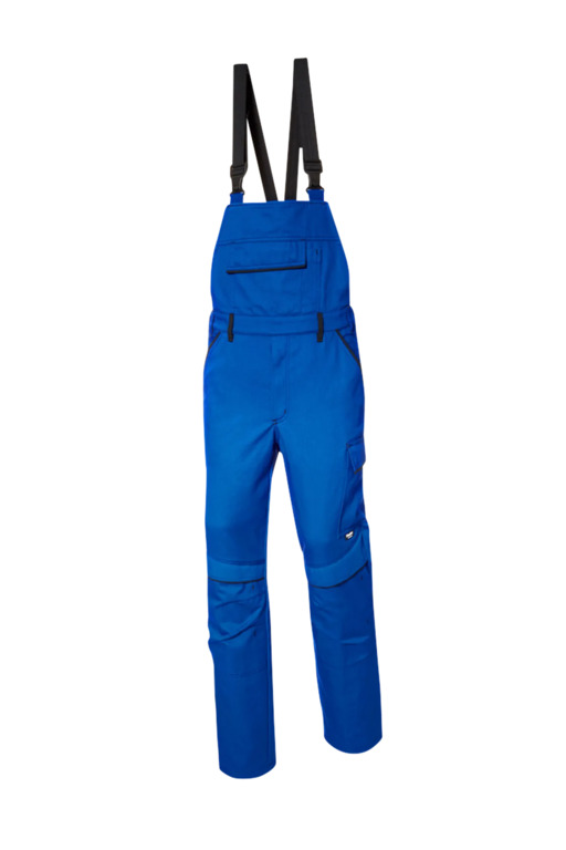 Latzhose mit Knietaschen, vollelastische Träger mit Fixlockschnallen, hochgezogener Nierenschutz, Latztasche mit Patte, abgetrenntes Stiftfach, zwei eingesetzte Seitentaschen, Zollstocktasche mit aufgesetzter Messertasche, zwei Gesäßtaschen, rechts mit Patte, eine Cargotasche, Schlitz mit Metallreißverschluss, Laschen für separate Flexi-Pocket, Kontrastelemente in Schwarz an den Gürtelschlaufen, Innenbund, Tascheneingriffen und an den Patten