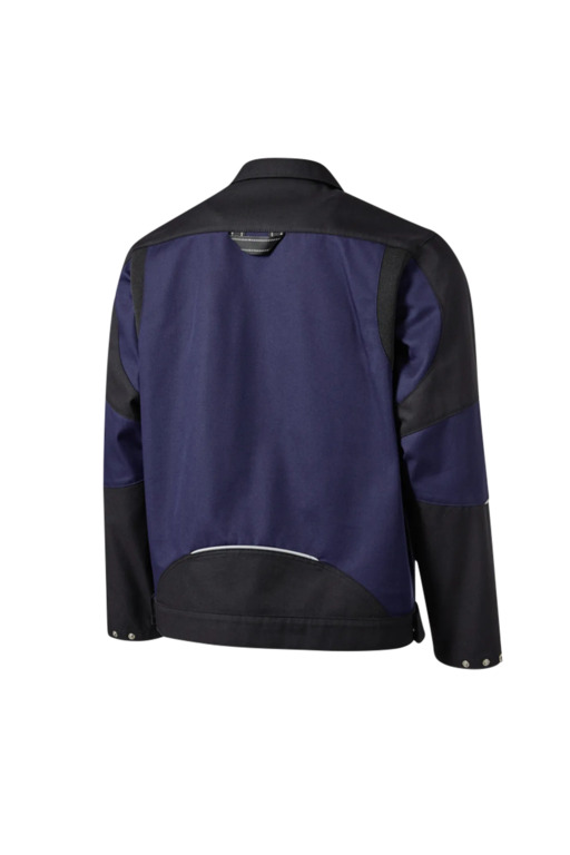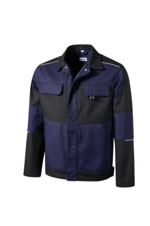 zweifarbige Bundjacke mit Reverskragen, Reflexpaspel, verdeckter Druckknopfverschluss, zwei eingesetzte Seitentaschen, eine aufgesetzte Brusttasche mit Patte und Stiftfach, verstellbare Bundweite durch Druckknopf, zweifach verstellbarer Ärmelsaum durch Druckknopf, Stretcheinsätze im Rücken, hohe Ärmel für mehr Bewegungsfreiheit, Collar, Aufhänger