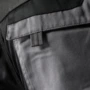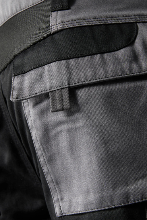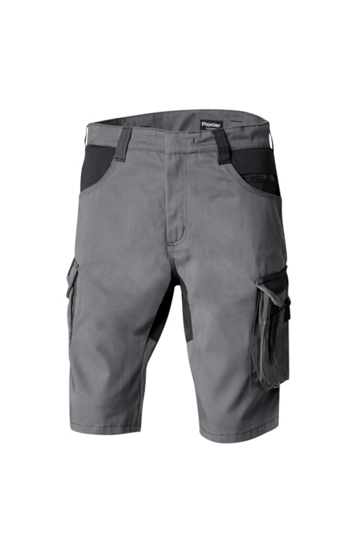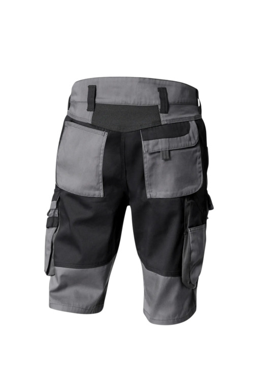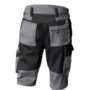 Zweifarbige Shorts mit hochgezogenem Bund, Stretcheinsätze in Schritt und Bund, zwei aufgesetzte Schenkeltaschen mit Blasebalg und Patte, links mit aufgesetzter schräger Handytasche & Stiftfach, Zollstocktaschen rechts und links, Reißverschluss im Schlitz, verdeckter Bundknopf, Reißverschlusstasche oberhalb der linken Eingrifftasche, zwei Gesäßtaschen davon die rechte mit Patte und Klettverschluss, sechs Gürtelschlaufen