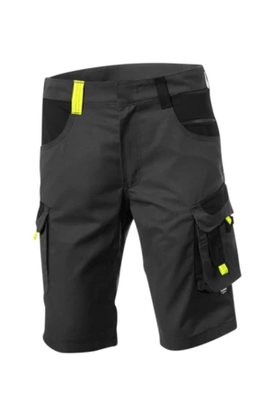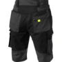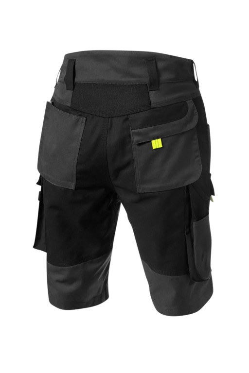 Zweifarbige Shorts mit hochgezogenem Bund, Stretcheinsätze in Schritt und Bund, zwei aufgesetzte Schenkeltaschen mit Blasebalg und Patte, links mit aufgesetzter schräger Handytasche & Stiftfach, Zollstocktaschen rechts und links, Reißverschluss im Schlitz, verdeckter Bundknopf, Reißverschlusstasche oberhalb der linken Eingrifftasche, zwei Gesäßtaschen davon die rechte mit Patte und Klettverschluss, sechs Gürtelschlaufen