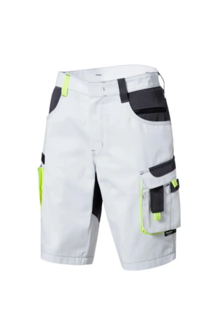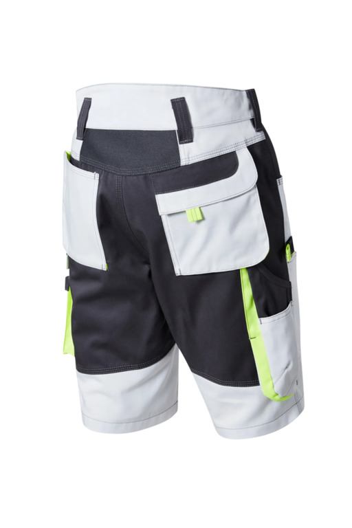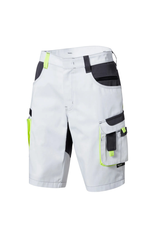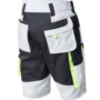 Zweifarbige Shorts mit hochgezogenem Bund, Stretcheinsätze in Schritt und Bund, eine aufgesetzte Schenkeltaschen mit Blasebalg und Patte links, eine Spachteltasche rechts und Karabiner, Zollstocktaschen, alle Taschenpatten mit verdeckten Druckern, Reißverschluss im Schlitz, verdeckter Bundknopf, Reißverschlusstasche oberhalb der linken Eingrifftasche, zwei Gesäßtaschen davon die rechte mit Patte