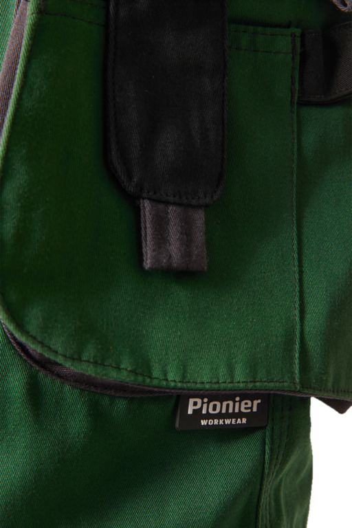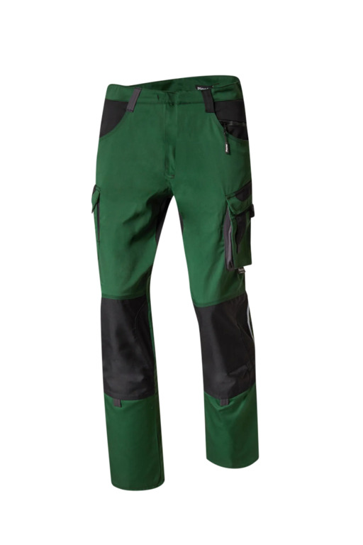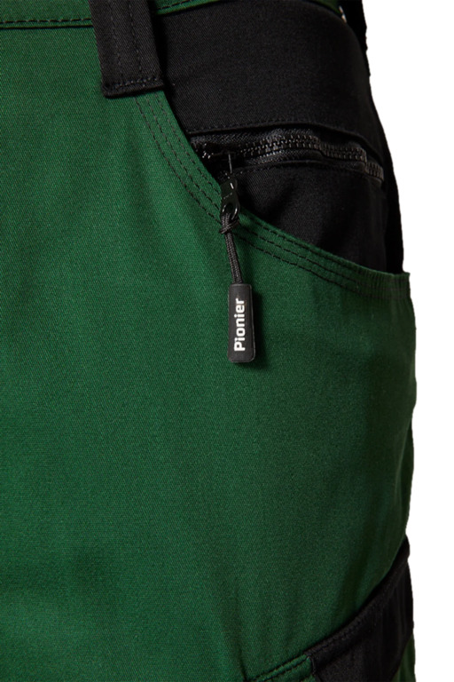 Robuste, zweifarbige Bundhose für Damen, zertifiziert nach DIN EN 14404 für Arbeiten in kniender Haltung, mit hochgezogenem Bund, Stretcheinsätze in Schritt und Bund, zwei aufgesetzte Schenkeltaschen mit Blasebalg und Patte, links mit aufgesetzter schräger Handytasche & Stiftfach, Zollstocktaschen rechts und links, Reißverschluss im Schlitz, verdeckter Bundknopf, Reißverschlusstasche oberhalb der linken Eingrifftasche, vorgeformte und CORDURA®-verstärkte Kniepolstertaschen, kombinierbar mit dem Pionier Kniepolster (W8 90020), zwei Gesäßtaschen davon die rechte mit Patte und Klettverschluss, sechs Gürtelschlaufen, Reflexpaspeln