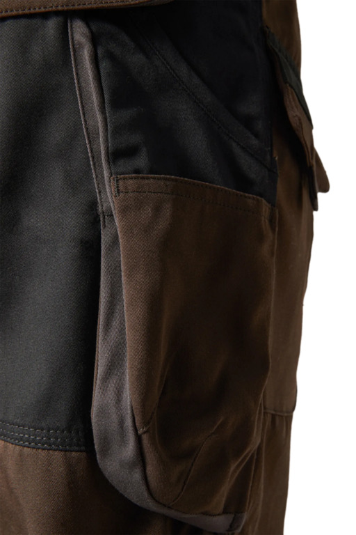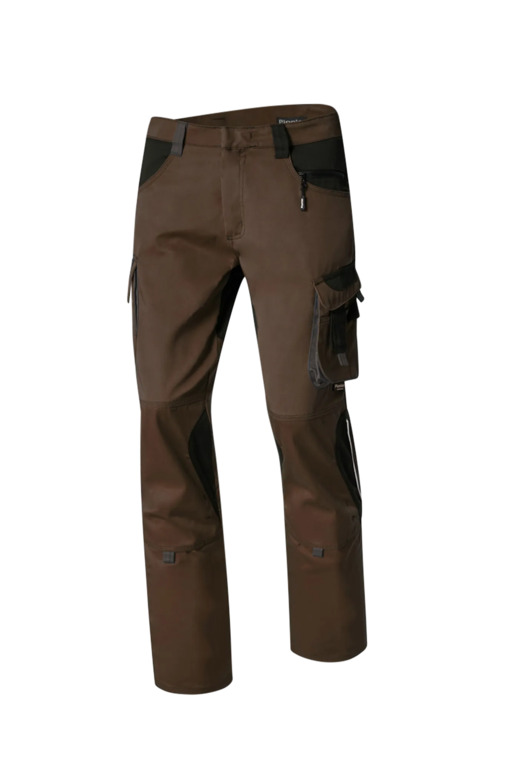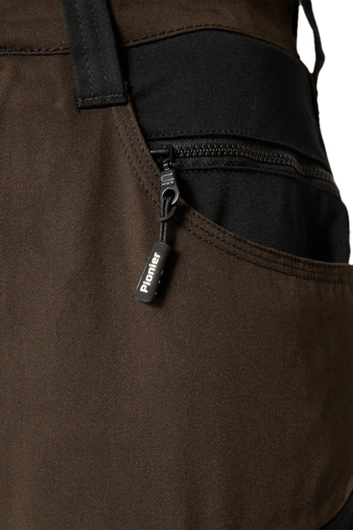 Zweifarbige Bundhose für Damen mit hochgezogenem Bund, Stretcheinsätze in Schritt und Bund, zwei aufgesetzte Schenkeltaschen mit Blasebalg und Patte, links mit aufgesetzter schräger Handytasche & Stiftfach, Zollstocktaschen rechts und links, Reißverschluss im Schlitz, verdeckter Bundknopf, Reißverschlusstasche oberhalb der linken Eingrifftasche, vorgeformte Kniepolstertaschen, kombinierbar mit dem Pionier Kniepolster (W8 90020), zwei Gesäßtaschen davon die rechte mit Patte und Klettverschluss, sechs Gürtelschlaufen, Reflexpaspeln