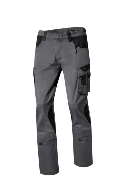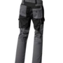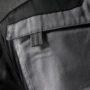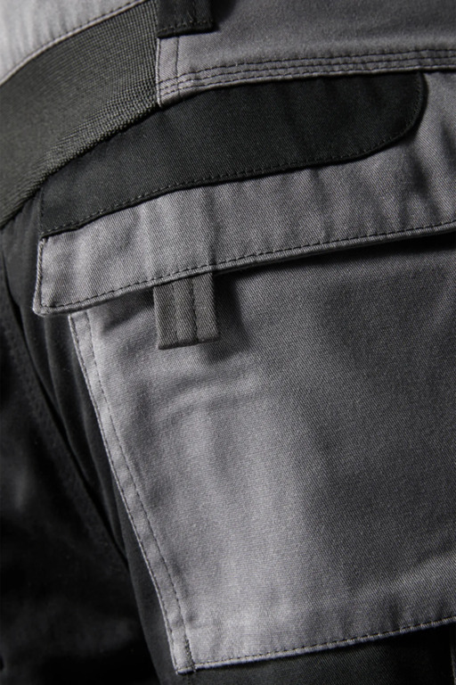 Zweifarbige Bundhose mit hochgezogenem Bund, Stretcheinsätze in Schritt und Bund, zwei aufgesetzte Schenkeltaschen mit Blasebalg und Patte, links mit aufgesetzter schräger Handytasche & Stiftfach, Zollstocktaschen rechts und links, Reißverschluss im Schlitz, verdeckter Bundknopf, Reißverschlusstasche oberhalb der linken Eingrifftasche, vorgeformte Kniepolstertaschen, kombinierbar mit dem Pionier Kniepolster (W8 90020), zwei Gesäßtaschen davon die rechte mit Patte und Klettverschluss, sechs Gürtelschlaufen, Reflexpaspeln