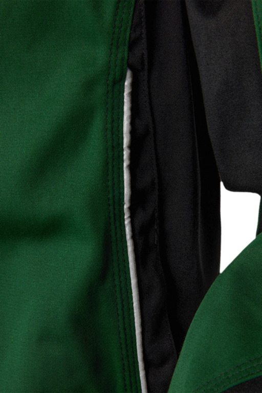 Leasingtaugliche zweifarbige Bundjacke, Stehkragen, verdeckter Reißverschluss, zwei eingesetzte Seitentaschen mit verdecktem Reißverschluss, Innentasche, eine innenliegende eingesetzte Brusttasche mit verdecktem Reißverschluss, eine aufgesetzte Blasebalg-Brusttasche mit Patte, Stifttasche, aufgesetzte Handytasche auf der rechten Brusttasche, extra langer Rücken, innenliegende Ärmelstrickbündchen, innenliegende Druckknöpfe zum Einknöpfen einer Innenweste, Bundweitenverstellung durch Druckknopflasche, Reflexpaspel vorne und an den Ellenbogen