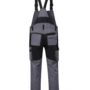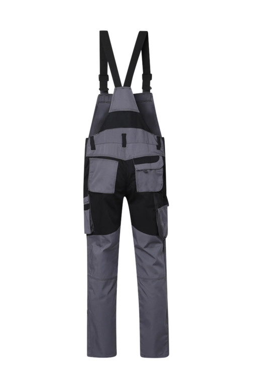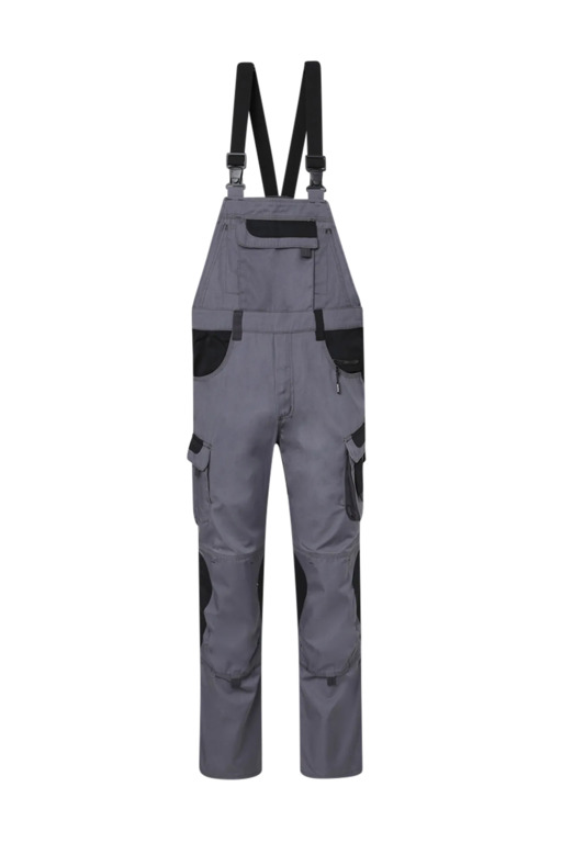 Zweifarbige Latzhose mit seitlichem Stretchkeil, Stretcheinsatz im Schritt, elastische verstellbare Träger mit Fixlockschnalle, Blasebalg-Latztasche mit Patte und Klettverschluss inkl. Stiftfach rechts und links, zwei aufgesetzte Schenkeltaschen mit Blasebalg und Patte, links mit aufgesetzter schräger Handytasche & Stiftfach, Zollstocktaschen rechts und links, Reißverschluss im Schlitz, Reißverschlusstasche oberhalb der linken Eingrifftasche, vorgeformte Kniepolstertaschen, kombinierbar mit dem Pionier Kniepolster (W8 90020), zwei Gesäßtaschen davon die rechte mit Patte und Klettverschluss, fünf Gürtelschlaufen, Reflexpaspeln