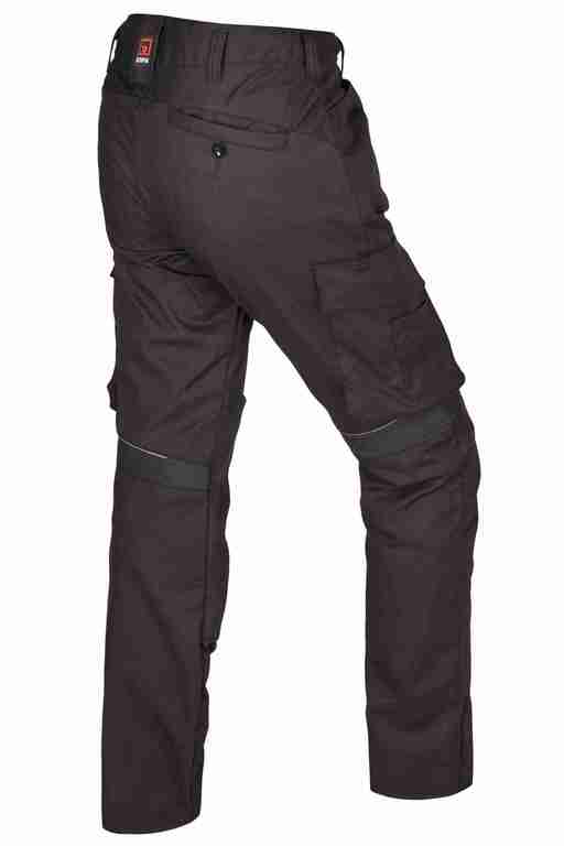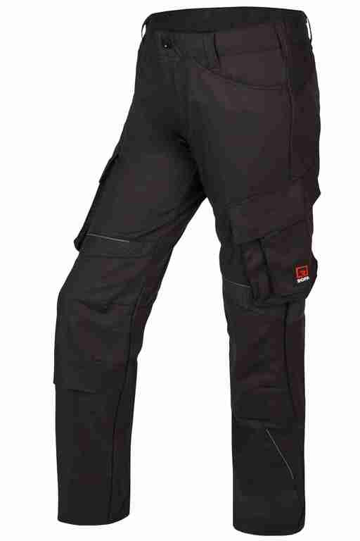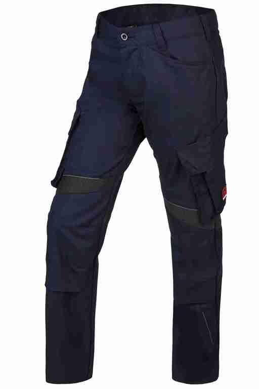 Bund mit Gürtelschlaufen und Knopf ? Schlitz mit Reißverschluss, 2 Seitentaschen ? links Cargotasche mit Patte, Druckknöpfen und aufgesetzer Tasche mit Klett ? rechts Cargotaschemit Patte, Druckknöpfen, integrierter Zollstocktasche und aufgesetzter Stifttasche ? Kniepolstertasche, Einschub von unten ? Gesäßtasche mit Knopf ? Stretcheinsätze am Bein ? Reflexpaspel am Bein.