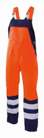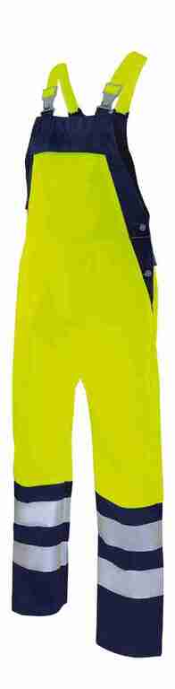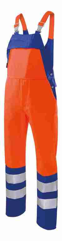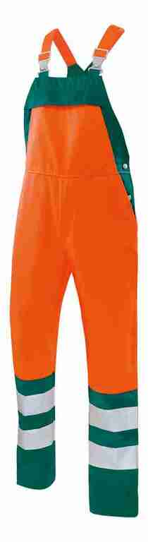 Stretchträger, Latztasche mit Patte und Druckknopf, Schlitz mit Reißverschluss, Bund weitenverstellbar durch seitliche Knopfleiste, 2 Seitentaschen, 2 Gesäßtaschen mit Patte und Druckknopf, rechts hinten Zollstocktasche mit aufgesetzter Handytasche mit Patte und Klett, 70mm Reflexstreifen um Beine.