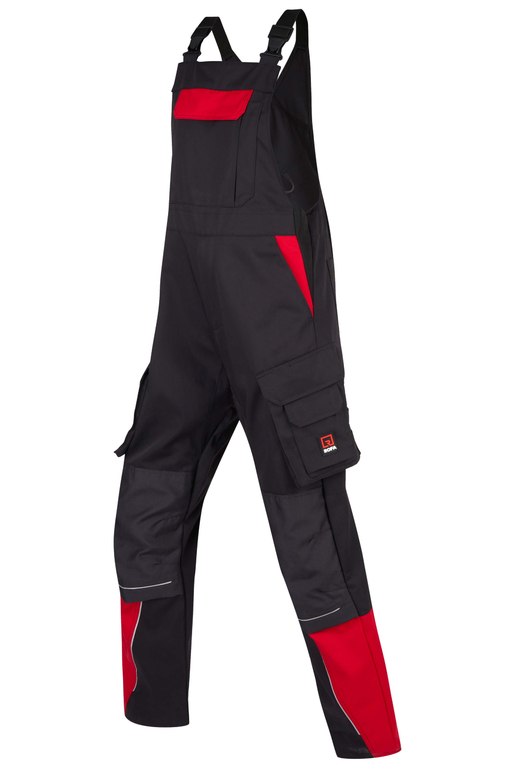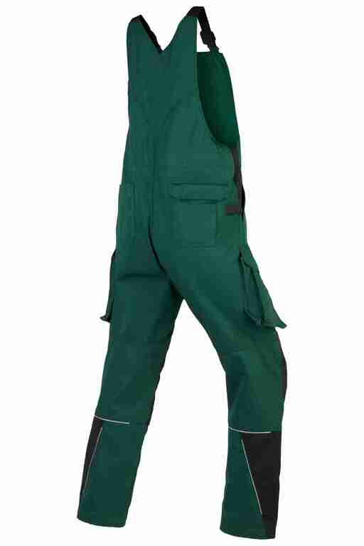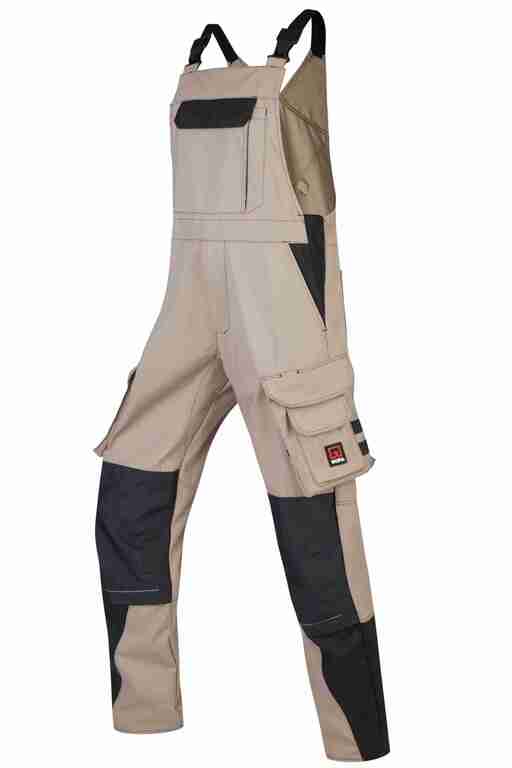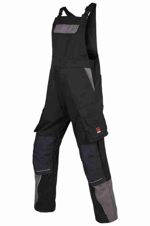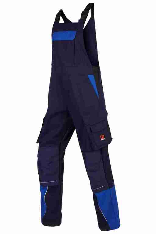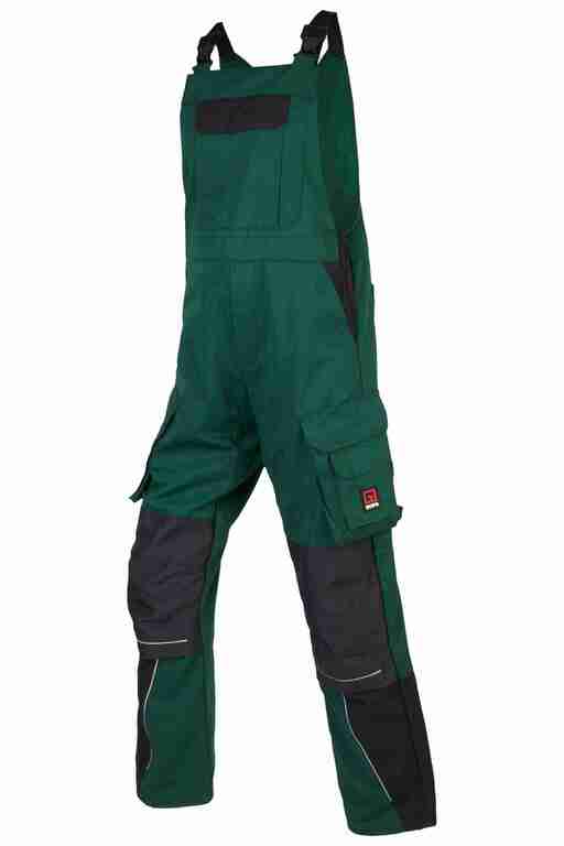 Stretchträger, Latztasche mit Patte und Klett sowie 2 abgenähten Stifttaschen, Schlitz mit Reißverschluss, Bund seitlich mit Dehneinsatz, 2 Seitentaschen, links Cargotasche mit zusätzlich aufgesetzter Tasche jeweils mit Patte und Klett sowie integrierter Stifttasche, rechts Cargotasche mit Patte und Klett und integrierter Zollstocktasche, zusätzlich aufgesetzte Tasche mit Unterteilungen, Knietaschen aus Cordura, 2 Gesäßtaschen, Gesäßtasche rechts mit Patte und Klett, Reflexpaspeln an den Beinen.