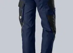 Träger mit Stretcheinsatz, Latztasche mit Patte und Druckknöpfen sowie abgenähter Stifttasche, Schlitz mit Reißverschluss, Bund weitenverstellbar durch seitliche Knopfleiste, 2 Seitentaschen, links Cargotasche mit Patte und Druckknöpfen, rechts Zollstocktasche mit Patte und Druckknopf, Knietaschen, rechts Gesäßtasche mit Patte und Druckknöpfen, Applikationen an den Beinen, Proban®.
