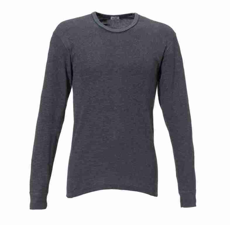 Rundhals mit elastischem Bündchen, Langarm, Ärmelabschluss mit elastischem Bündchen. Eigenschaften:hochstrapazierfähig, sehr gute Wasch- und Trocknereigenschaften, formbeständig, sehr leicht, angenehmes Trageverhalten durch langstapelige und supergekämmte Baumwolle, keine Feuchtigkeitsaufnahme durch porösem Faserkern, atmungsaktiv durch Zweilagenstrick.