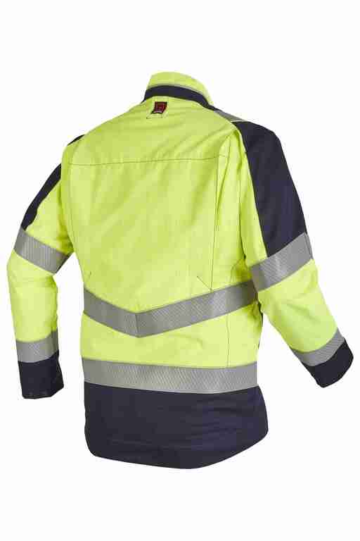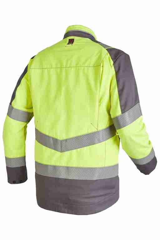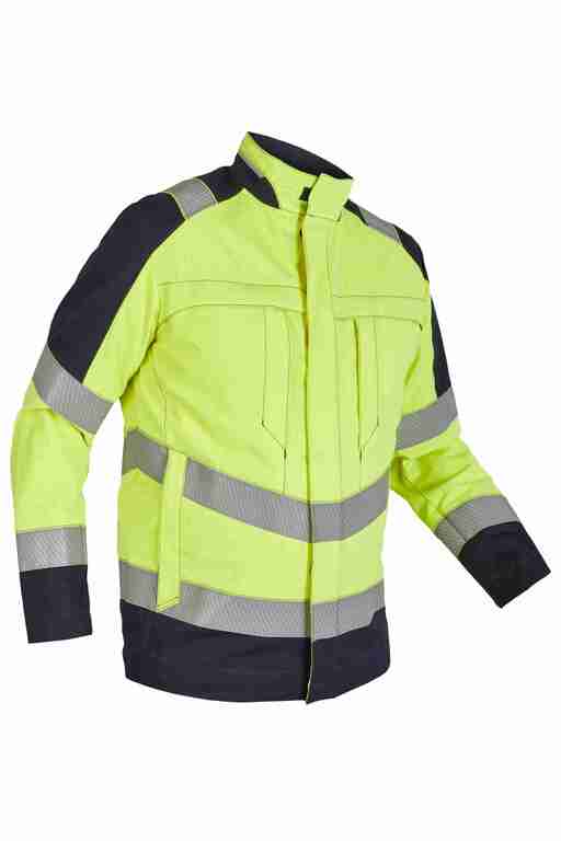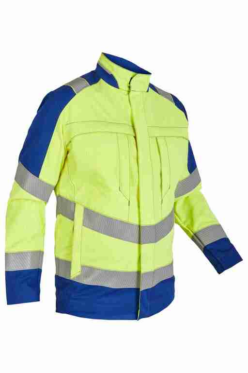 Material: Material 659, leuchtgelb Gewebe 166, Köper, 46%Modacryl, 31%Baumwolle, 21%Polyamid,2%sonstige Fasern, ca.270g/qm, FC , Kontrast:Gewebe 359, Köper, 64% Baumwolle, 34% Polyester, 2% sonstige Faser, 250 g/qm, FC, FR 2. Lage: Gewebe 360, Köper, 65% Baumwolle, 35% Polyester, 250 g/qm, FR