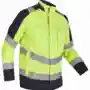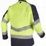 Stehkragen, vordere Mitte mit Reißverschluss und Druckknöpfen, 2 vertikale Brusttaschen mit Reißverschluss, Ärmelabschluss weitenverstellbar durch Druckknopf, 2 Seitentaschen mit Reißverschluss, Bewegungsfalten im Rückenteil, verlängerter Rücken, 2 große Innentaschen, 50mm Reflexstreifen um Rumpf, Ärmel und über Schulter, Reflexpaspel am Kragen, teilw. 2-lagig.