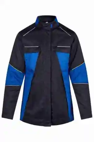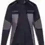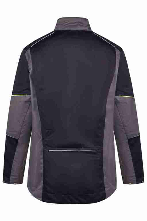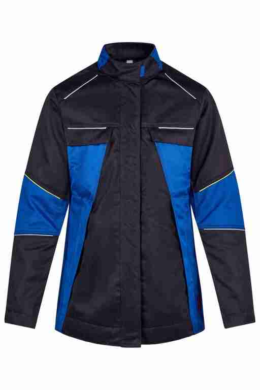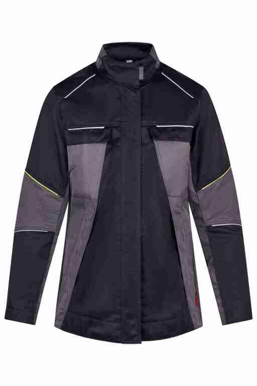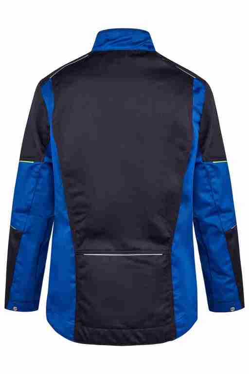 Stehkragen, vordere Mitte mit Druckknöpfen, Kragen mit Klett, 2 Brusttaschen mit Patte und Druckknopf, Ärmelabschluss weitenverstellbar durch Druckknöpfe, 2 Seitentaschen mit Patte und Druckknopf, Bewegungsfalten im Rückenteil, verlängerter Rücken, links Brustinnentaschen mit Klett, zusätzlich 2 große Innentaschen, Reflexpaspel an Vorder-, Rückenteil, Schultern und Ärmeln, leuchtfarbende Kontrastpaspel an Ärmeln.