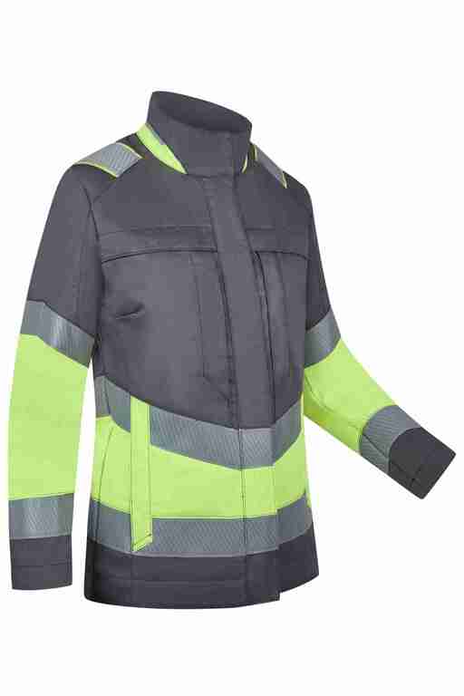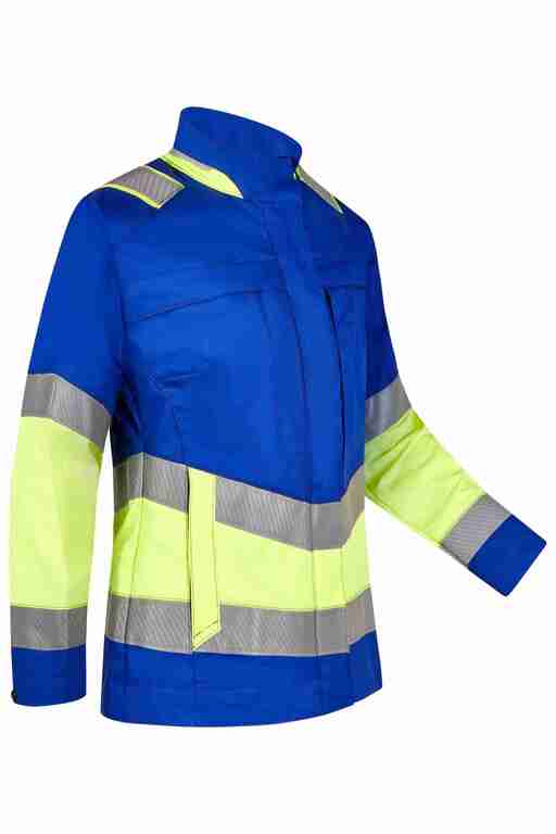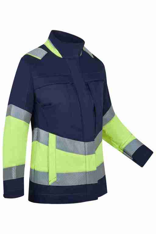 Material: Material 659, leuchtgelb Gewebe 166, Köper, 46%Modacryl, 31%Baumwolle, 21%Polyamid,2%sonstige Fasern, ca.270g/qm, FC , Kontrast:Gewebe 359, Köper, 64% Baumwolle, 34% Polyester, 2% sonstige Faser, 250 g/qm, FC, FR 2. Lage: Gewebe 360, Köper, 65% Baumwolle, 35% Polyester, 250 g/qm, FR