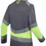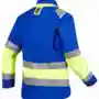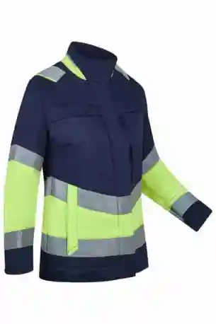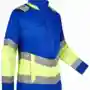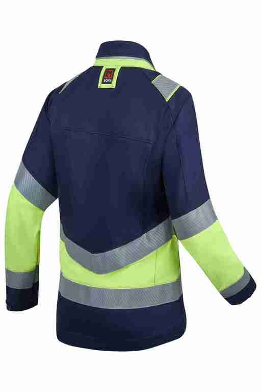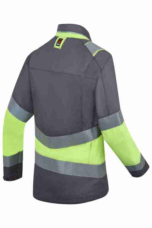 Stehkragen, vordere Mitte mit Reißverschluss und Druckknöpfen, 2 vertikale Brusttaschen mit Reißverschluss, Ärmelabschluss weitenverstellbar durch Druckknopf, 2 Seitentaschen mit Reißverschluss, Bewegungsfalten im Rückenteil, verlängerter Rücken, 2 große Innentaschen, 50mm Reflexstreifen um Rumpf, Ärmel und über Schulter, Reflexpaspel am Kragen, teilweise. 2-lagig.
