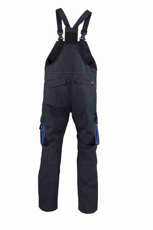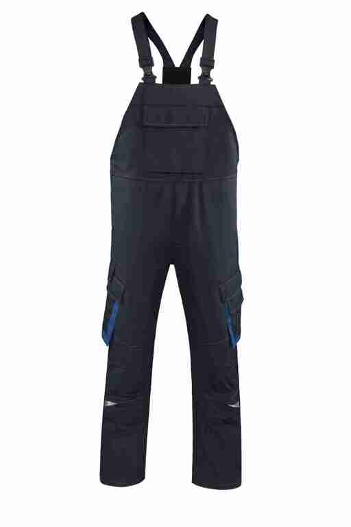 Träger mit Stretcheinsatz, Latztasche mit Patte und Klett, Schlitz mit Reißverschluss, Bund weitenverstellbar durch seitliche Knopfleiste, 2 Seitentaschen, links Cargotasche mit aufgesetzter Smartphonetasche jeweils mit Patte und Klett, rechts Cargotasche mit integrierter Zollstocktasche jeweils mit Patte und Klett, zusätzlich aufgesetzte Tasche mit Unterteilungen, Knietaschen, 2 Gesäßtaschen, Gesäßtasche links mit Patte und Klett, rechts mit Reißverschluss, Reflexapplikationen an den Beinen, komplett zweilagig.