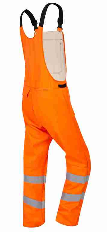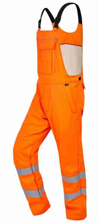 Stretchträger, Latztasche mit Patte und Druckknöpfen, Schlitz mit Reißverschluss, Bund weitenverstellbar durch Klettriegel, 2 Seitentaschen mit Patte, rechts Gesäßtasche mit Patte und Druckknöpfen, 70 mm Reflexstreifen um Beine, Reflexpaspel am Latz.
