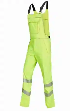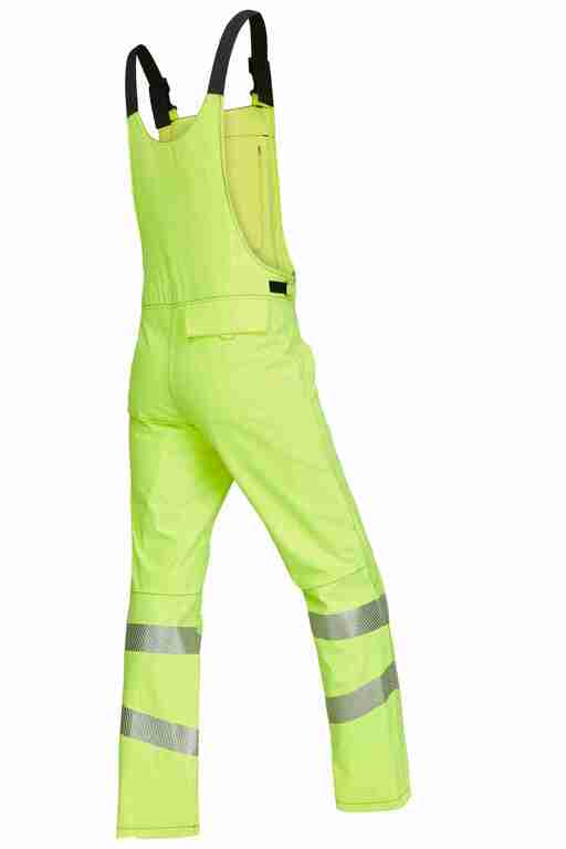 Stretchträger, Latztasche mit Patte und Druckknöpfen, Schlitz mit Reißverschluss, Bund weitenverstellbar durch Klettriegel, 2 Seitentaschen mit Patte, rechts Gesäßtasche mit Patte und Druckknöpfen, 70 mm segmentierte Reflexstreifen um Beine, Reflexpaspel am Latz.