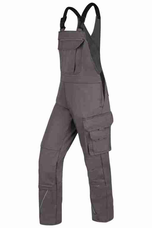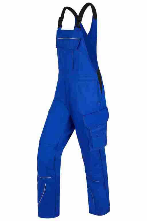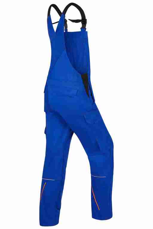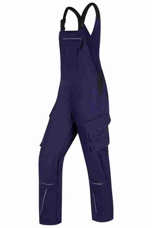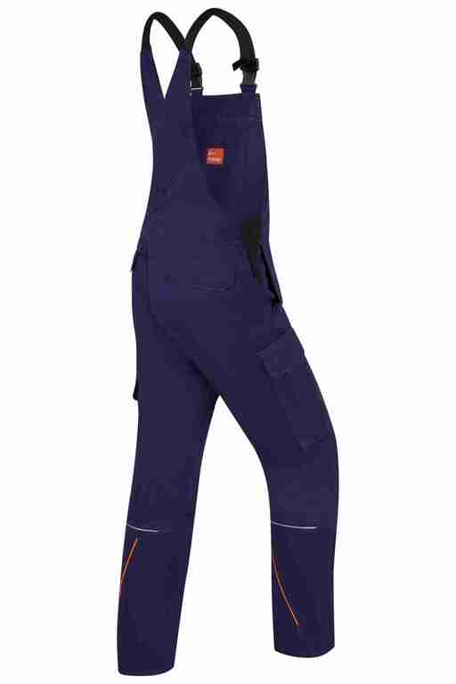 Stretchträger, Latztasche mit Patte und Druckknöpfen, Bund seitlich mit Dehneinsatz, 2 Seitentaschen, links Cargotasche mit aufgesetzter Smartphonetasche jeweils mit Patte und Druckknöpfen, rechts Zollstocktasche mit Patte und Druckknopf, Knietaschen, 2 Gesäßtaschen mit Patte und Druckknöpfen, einfache Hosenbeinverlängerung durch skandinavischen Saum, Reflexpaspel an Latz und Hosenbeinen, leuchtfarbende Kontrastpaspel an Hinterhose.
