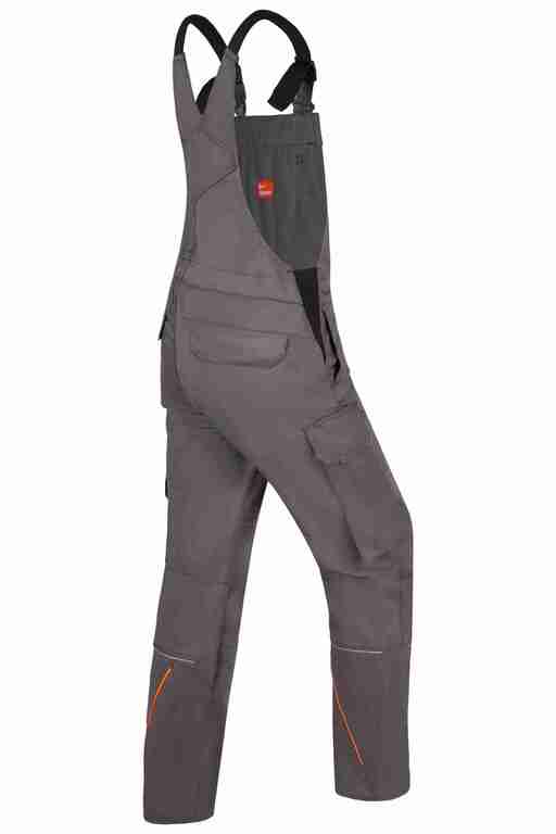 Stretchträger, Latztasche mit Patte und Druckknöpfen, Bund seitlich mit Dehneinsatz, 2 Seitentaschen, links Cargotasche mit aufgesetzter Smartphonetasche jeweils mit Patte und Druckknöpfen, rechts Zollstocktasche mit Patte und Druckknopf, Knietaschen, 2 Gesäßtaschen mit Patte und Druckknöpfen, Reflexpaspel an Latz und Hosenbeinen, leuchtfarbende Kontrastpaspel an Hinterhose, Vorderteil zweilagig.