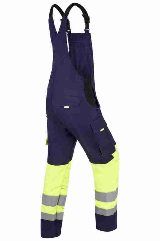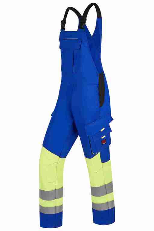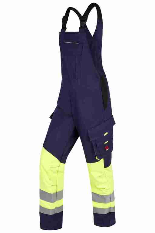 Stretchträger, Latztasche mit Patte und Druckknöpfen, Bund seitlich mit Dehneinsatz, 2 Seitentaschen, links Cargotasche mit aufgesetzter Smartphonetasche jeweils mit Patte und Druckknöpfen, rechts Zollstocktasche mit Patte und Druckknopf, Knietaschen, 1 Gesäßtasche rechts mit Patte und Druckknöpfen, einfache Hosenbeinverlängerung durch skandinavischen Saum, 50 und 70mm Reflexstreifen um Beine.