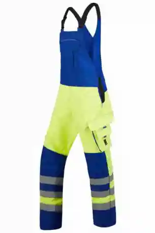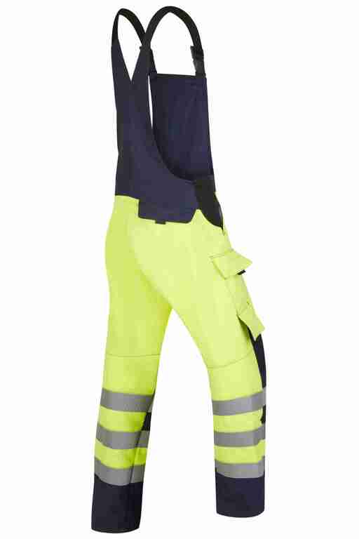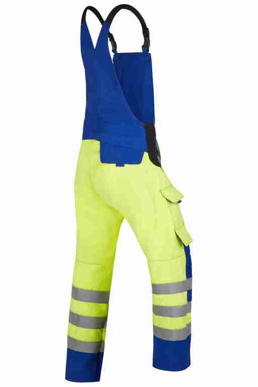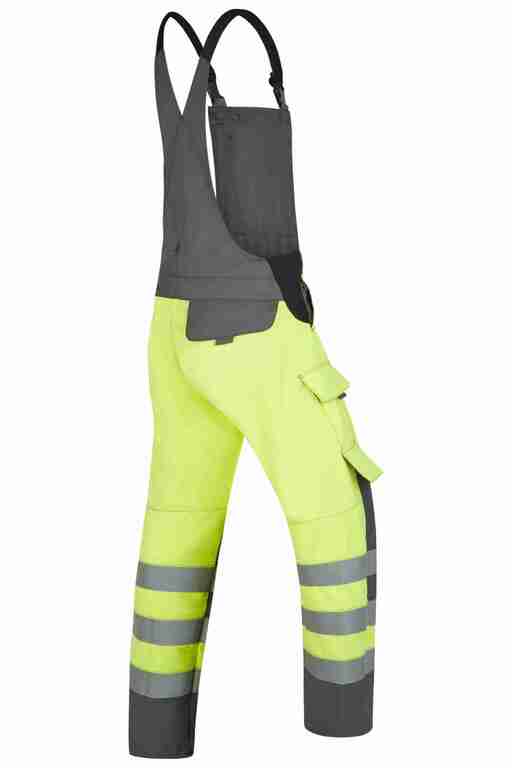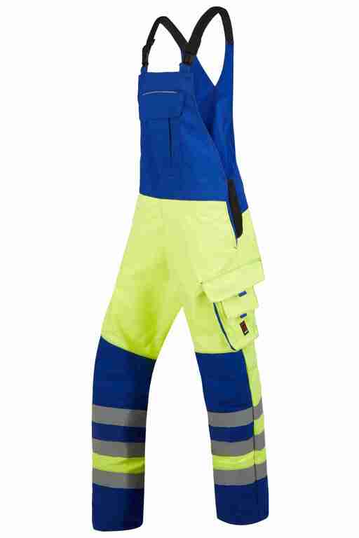 Stretchträger, Latztasche mit Patte und Druckknöpfen, Bund seitlich mit Dehneinsatz, 2 Seitentaschen, links Cargotasche mit aufgesetzter Smartphonetasche jeweils mit Patte und Druckknöpfen, rechts Zollstocktasche mit Patte und Druckknopf, Gesäßtaschen mit Patte und Druckknöpfen, 3x 50mm Reflexstreifen je Bein, Reflexpaspel an Latz, tw. 2-lagig.