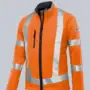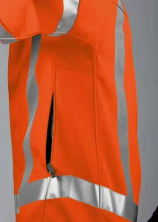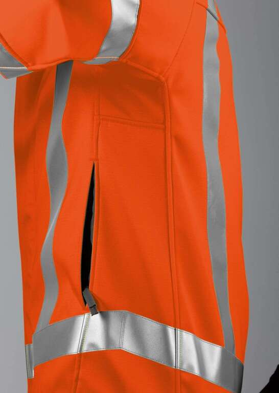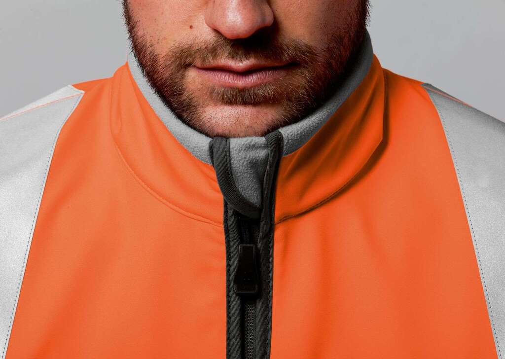 Stehkragen, Frontreißverschluss mit Fleecekinnschutz, 1 Brusttasche und 2 Seitentaschen mit Reißverschluss, ergonomisch geformter Ärmel, Windschutz am Ärmelabschluss, Armliftsystem für mehr Bewegungsfreiheit, 1 Innentasche, innenliegende Saumweitenverstellung, verlängerte Rückenpartie, je 2 Reflexstreifen auf dem Ärmel, 1 umlaufender Reflexstreifen oberhalb des Saumes, je 2 umlaufende vertikale Reflexstreifen vorn und hinten wasserabweisend, winddicht & atmungsaktiv 360° Sichtbarkeit wärmende Fleece-Innenseite normale Passform EN ISO 20471 Warnschutz Klasse 3,