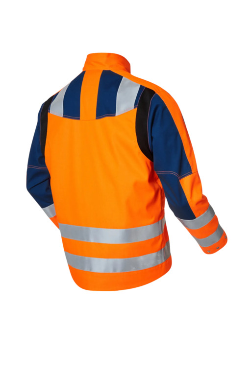 Bundjacke, Stehkragen, 2 Brusttaschen mit Patte, 2 Seitentaschen mit Patte, Front-RV mit Blende und verdeckten Druckknöpfen, 1 Innentasche, verlängerter Rücken, Lüftungsschlitze am Unterärmel, Stretcheinsätze an der Schulter, Reflexstreifen