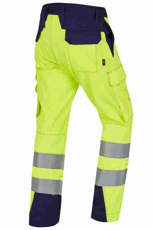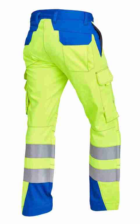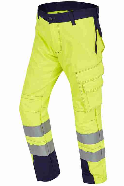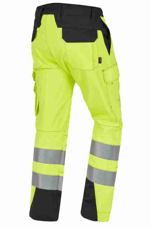 Bund mit Gürtelschlaufen und Knopf, Schlitz mit Reißverschluss, 2 Seitentaschen, links Cargotasche mit aufgesetzter Smartphonetasche jeweils mit Patte und Druckknöpfen, rechts Zollstocktasche mit Patte und Druckknopf, Knietaschen, einfache Hosenbeinverlängerung durch skandinavischen Saum, Gesäßtaschen mit Patte und Druckknöpfen, 70mm Reflexstreifen um Beine.