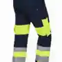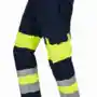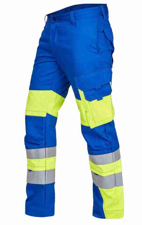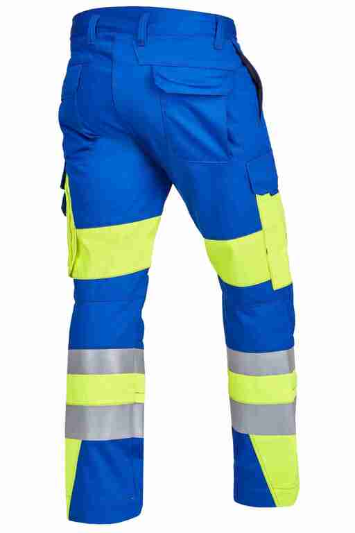 Bund mit Gürtelschlaufen und Knopf, Schlitz mit Reißverschluss, 2 Seitentaschen, links Cargotasche mit aufgesetzter Smartphonetasche jeweils mit Patte und Druckknöpfen, rechts Zollstocktasche mit Patte und Druckknopf, Knietaschen, Gesäßtaschen mit Patte und Druckknöpfen, einfache Hosenbeinverlängerung durch skandinavischen Saum, 50mm und 70mm Reflexstreifen um Beine.