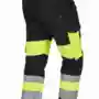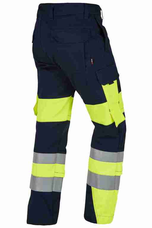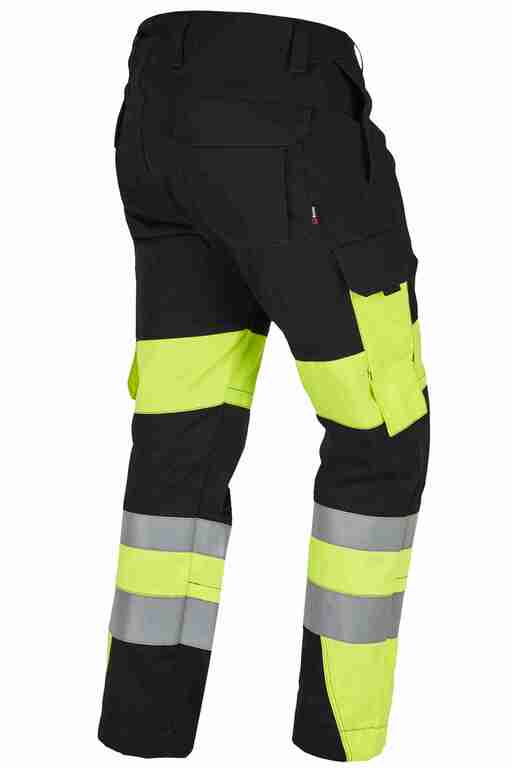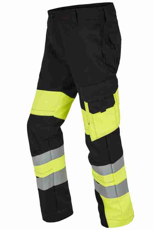 Bund mit Gürtelschlaufen und Knopf, Schlitz mit Reißverschluss, 2 Seitentaschen, links Cargotasche mit aufgesetzter Smartphonetasche jeweils mit Patte und Druckknöpfen, rechts Zollstocktasche mit Patte und Druckknopf, Knietaschen, Gesäßtaschen mit Patte und Druckknöpfen, einfache Hosenbeinverlängerung durch skandinavischen Saum, 50mm und 70mm Reflexstreifen um Beine, Vorderteil zweilagig. .