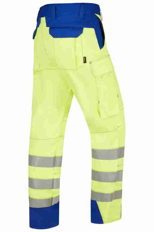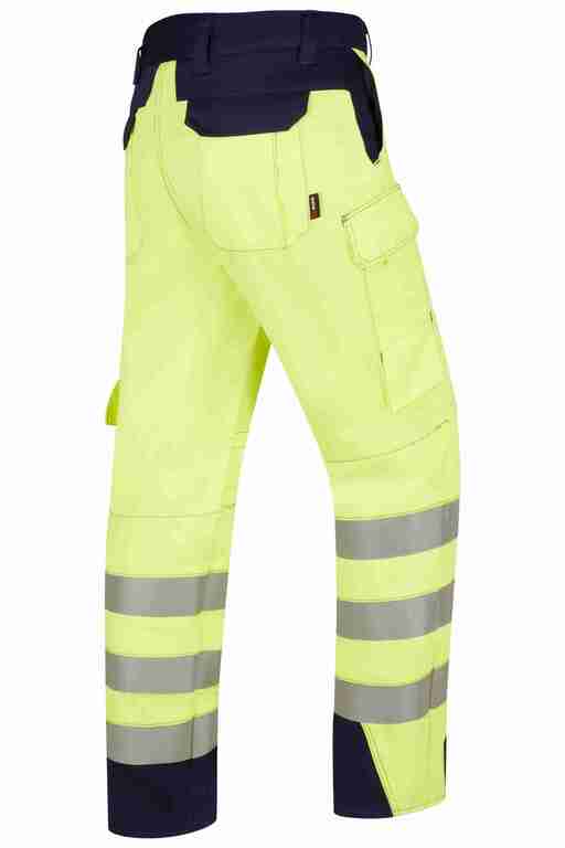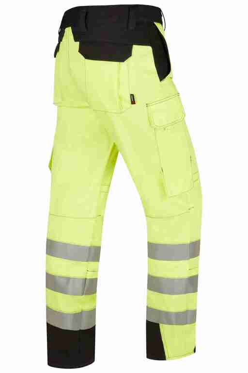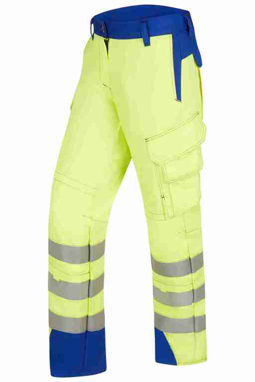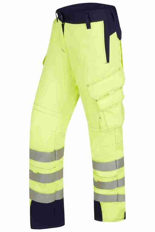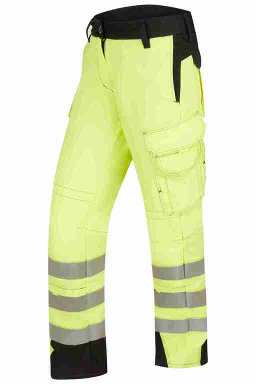 Bund mit Gürtelschlaufen und Knopf, Schlitz mit Reißverschluss, 2 Seitentaschen, links Cargotasche mit aufgesetzter Smartphonetasche jeweils mit Patte und Druckknöpfen, rechts Zollstocktasche mit Patte und Druckknopf, Knietaschen, Gesäßtaschen mit Patte und Druckknöpfen, 3x 50mm Reflexstreifen um Beine, Vorderteil zweilagig.