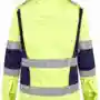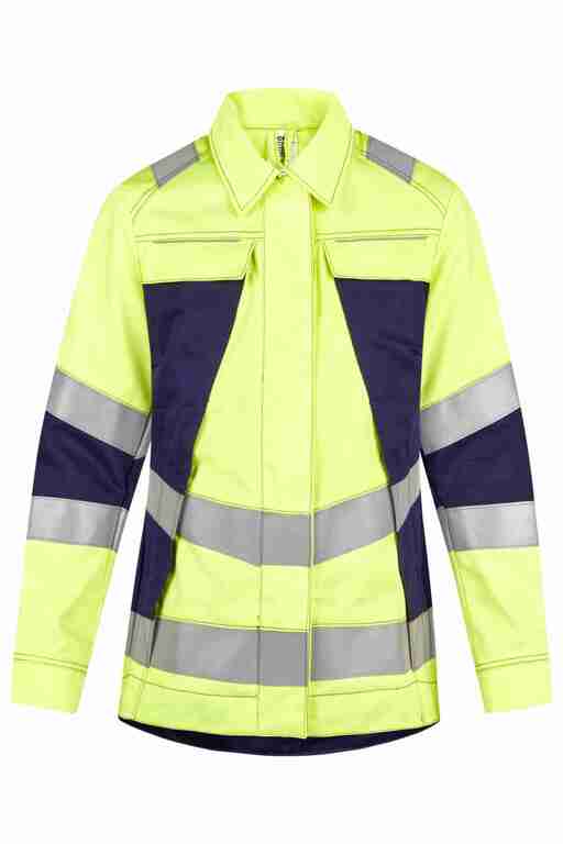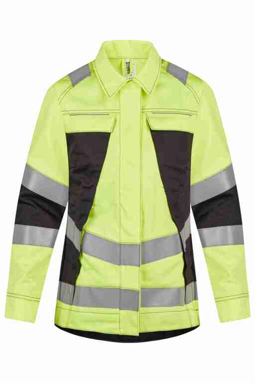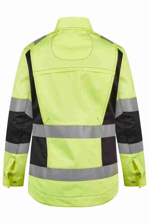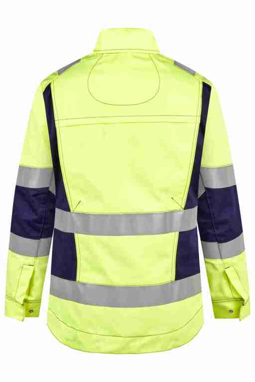 Umlegekragen, vordere Mitte mit Reißverschluss und Druckknöpfen, 2 Brusttaschen mit Patte und Druckknopf, Ärmelabschluss weitenverstellbar durch Druckknöpfe, 2 Seitentaschen mit Patte und Druckknopf, Bewegungsfalten im Rückenteil, verlängerter Rücken, links Brustinnentaschen mit Klett, zusätzlich 2 große Innentaschen, 50mm Reflexstreifen um Rumpf, Ärmel und über Schulter, Reflexpaspel in vorderer Passe.