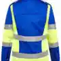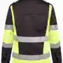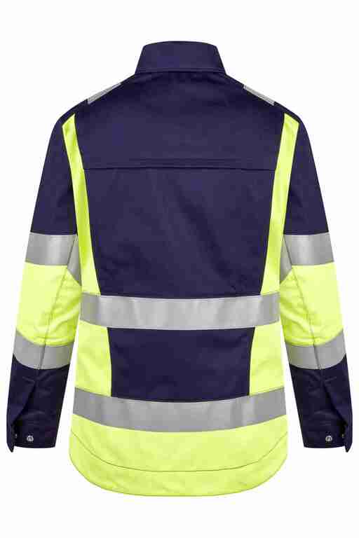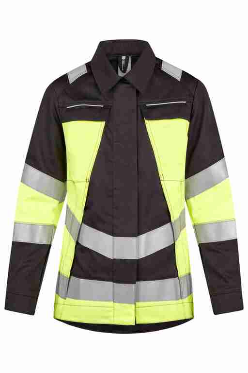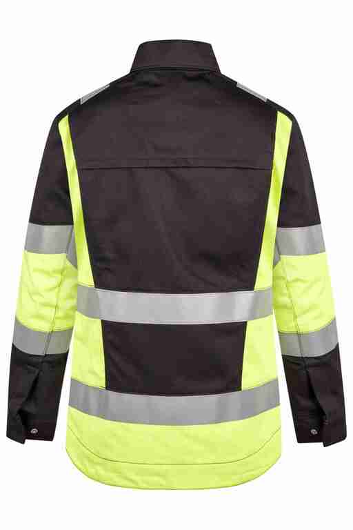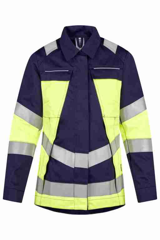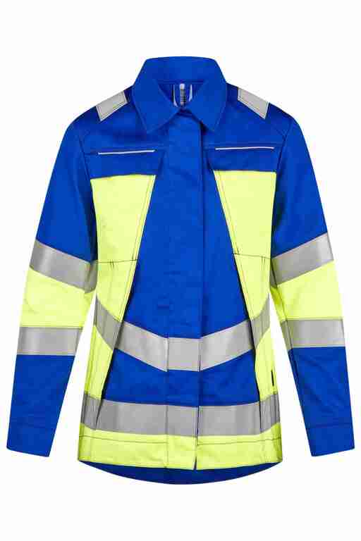Umlegekragen, vordere Mitte mit Reißverschluss und Druckknöpfen, 2 Brusttaschen mit Patte und Druckknopf, Ärmelabschluss weitenverstellbar durch Druckknöpfe, 2 Seitentaschen mit Patte und Druckknopf, Bewegungsfalten im Rückenteil, verlängerter Rücken, links Brustinnentaschen mit Klett, zusätzlich 2 große Innentaschen, 50mm Reflexstreifen um Rumpf, Ärmel und über Schulter, Reflexpaspel in vorderer Passe.