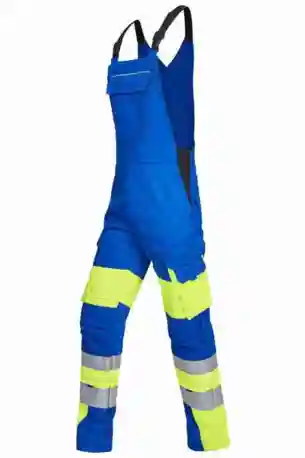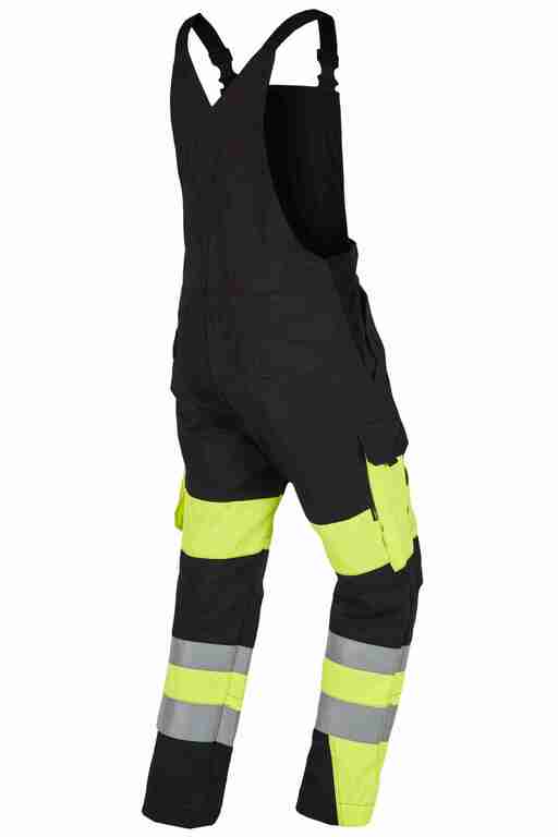 Stretchträger, Latztasche mit Patte und Druckknöpfen, Schlitz mit Reißverschluss, Bund seitlich mit Dehneinsatz, 2 Seitentaschen, links Cargotasche mit aufgesetzter Smartphonetasche jeweils mit Patte und Druckknöpfen, rechts Zollstocktasche mit Patte und Druckknopf, Knietaschen, Gesäßtaschen mit Patte und Druckknöpfen, einfache Hosenbeinverlängerung durch skandinavischen Saum, 50mm und 70mm Reflexstreifen um Beine, Reflexpaspel an Latz.
