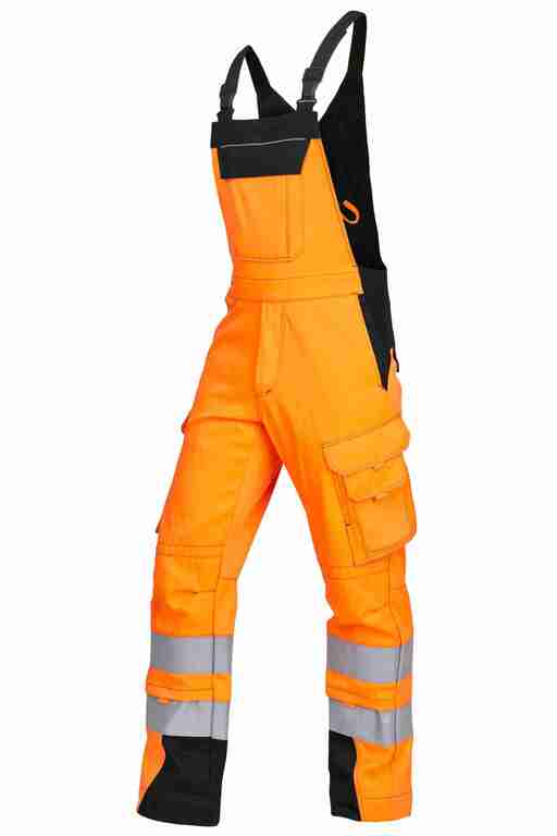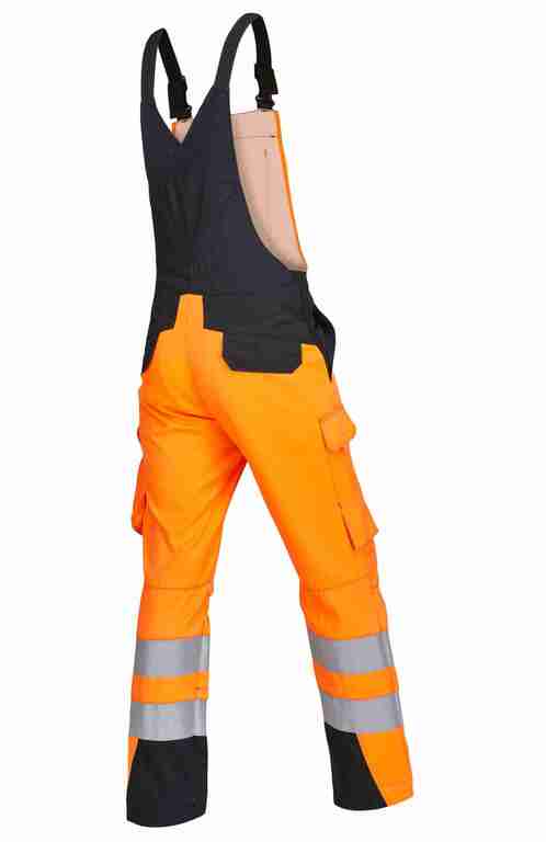 Stretchträger, Latztasche mit Patte und Druckknöpfen, Schlitz mit Reißverschluss, Bund seitlich mit Dehneinsatz, 2 Seitentaschen, links Cargotasche mit aufgesetzter Smartphonetasche jeweils mit Patte und Druckknöpfen, rechts Zollstocktasche mit Patte und Druckknopf, Knietaschen, Gesäßtaschen mit Patte und Druckknöpfen, einfache Hosenbeinverlängerung durch skandinavischen Saum, 70mm Reflexstreifen um Beine, Reflexpaspel an Latz.