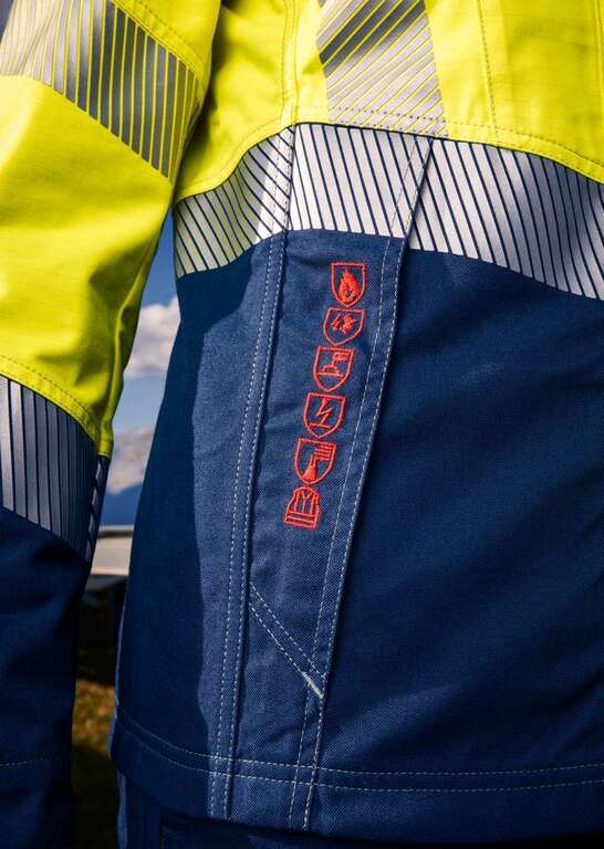 Stehkragen, verdeckter Reißverschluss und Druckknopfleiste, 2 mit Patte verschließbare aufgesetzte Brusttaschen, 2 mit Blende verschließbare Seitentaschen, 1 innenliegende Napoleontasche, verschließbare Ärmelbündchen, ergonomisch geformter Ärmel, Armliftsystem für mehr Bewegungsfreiheit, je 2 Reflexstreifen auf dem Ärmel, 1 umlaufender horizontaler Reflexstreifen, 2 umlaufende vertikale Reflexstreifen vorn und hinten ATPV = 7,1 cal/cm² dehnbare Reflexstreifen für mehr Tragekomfort extrem leichtes Gewebe Armliftsystem für mehr Bewegungsfreiheit EN 1149-5 Elektrostatisch ableitfähige Schutzkleidung, EN 13034-6 Chemikalienschutz Typ 6, EN 61482-2 Störlichtbogenschutz Kl. 1, EN ISO 11611 Schweißerschutz Kl. 1 - A1, EN ISO 11612 Hitze- und Flammschutz A1, B1, C1, F1, EN ISO 20471 Warnschutz Klasse 1, ab Gr. M Klasse 2,