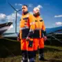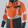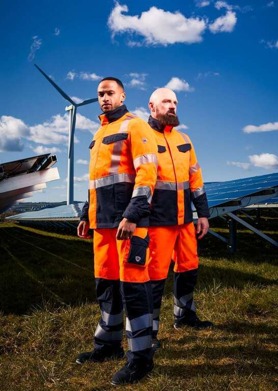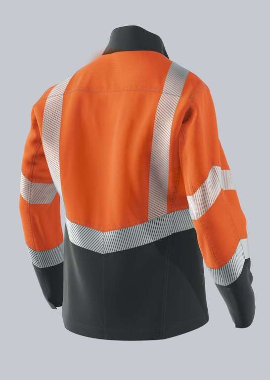Stehkragen, verdeckter Reißverschluss und Druckknopfleiste, 2 mit Patte verschließbare aufgesetzte Brusttaschen, 2 mit Blende verschließbare Seitentaschen, 1 innenliegende Napoleontasche, verschließbare Ärmelbündchen, ergonomisch geformter Ärmel, Armliftsystem für mehr Bewegungsfreiheit, je 2 Reflexstreifen auf dem Ärmel, 1 umlaufender horizontaler Reflexstreifen, 2 umlaufende vertikale Reflexstreifen vorn und hinten ATPV = 8,6 cal/cm² dehnbare Reflexstreifen für mehr Tragekomfort Armliftsystem für mehr Bewegungsfreiheit permanenter Chemikalienschutz (getestet nach 30 Wäschen) EN 1149-5 Elektrostatisch ableitfähige Schutzkleidung, EN 13034-6 Chemikalienschutz Typ 6, EN 61482-2 Störlichtbogenschutz Kl. 1, EN ISO 11611 Schweißerschutz Kl. 1 - A1, EN ISO 11612 Hitze- und Flammschutz A1, B1, C1, F1, EN ISO 20471 Warnschutz Klasse 2,