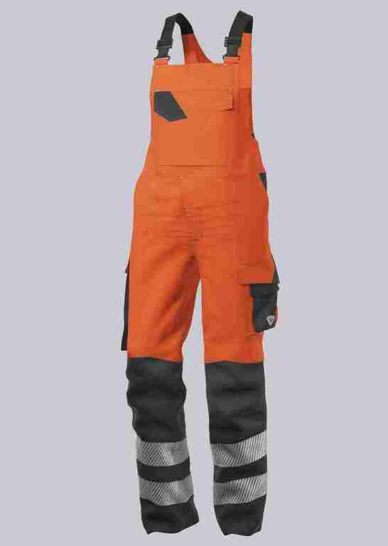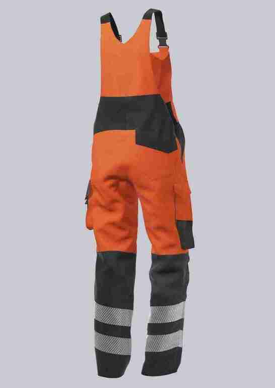 Stretchträger mit Kunststoff-Steckschnallen, doppelte Latztasche mit Reißverschluss und Taschenklappe, hochgezogener Rücken, ergonomischer Schnitt, 2 Seitentaschen, 1 mit Patte verschließbare Gesäßtasche, 1 geräumige Schenkeltasche mit aufgesetzter Smartphonetasche, freihängende Zollstocktasche mit Stifttaschen, je 2 umlaufende Reflexstreifen (7 cm) auf dem unteren Bein, vorgeformtes Bein, Kniepolstertaschen (Kniepolster 1839 bitte separat bestellen)