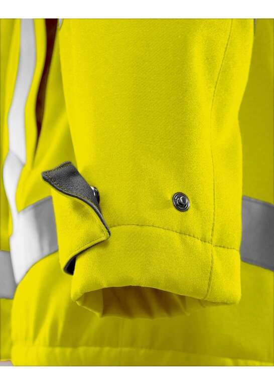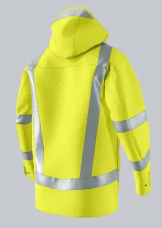 Stehkragen, abknöpfbare Kapuze mit doppelter Weitenregulierung, wasserdichter Frontreißverschluss mit doppelte Druckknopfleiste, verschweißte Nähte, 2 Seitentaschen und 1 Brusttasche mit Druckknopf verschließbar, 1 Napoleontasche mit Reißverschluss, ergonomisch geformter Ärmel, verstellbarer Ärmelabschluss, 1 Innentasche mit Reißverschluss, große Reparaturöffnung, je 2 Reflexstreifen auf dem Ärmel, 1 umlaufender Reflexstreifen oberhalb des Saumes, je 2 umlaufende vertikale Reflexstreifen vorne und hinten, kombinierbar mit wärmender BP® Fleecejacke 2425-860-53 360° Sichtbarkeit wasserdicht & winddicht permanenter Flammschutz normale Passform EN 343 Wetterschutz Wasserdicht Kl. 3, atmungsaktiv Kl. 3, EN 14058 Schutz bei kühlen Umgebungen Kl. 1 3 x WP in Verbindung mit Fleecejacke 2425-860, EN 1149-5 Elektrostatisch ableitfähige Schutzkleidung, EN 13034-6 Chemikalienschutz Typ 6, EN 61482-2 Störlichtbogenschutz Kl. 2, EN ISO 11611 Schweißerschutz Kl. 1 - A1, EN ISO 11612 Hitze- und Flammschutz A1, B1, C2, F1, EN ISO 20471 Warnschutz Klasse 3,