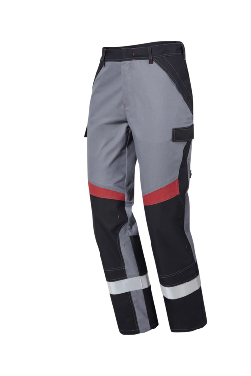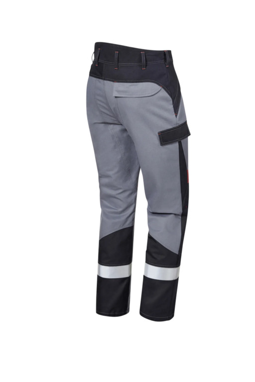 Dreifarbig, erhöhter Rückenbund, verdeckter Patentknopf, Druckknöpfe im Schlitz, seitliche Eingrifftaschen mit Blende und verdecktem Druckkopf, Pattentasche auf linkem Oberschenkel und rechter doppelter Zollstocktasche mit Patte und verdeckten Druckknöpfen, innenliegende Knietaschen mit Kontrasteinsatz oberhalb der rechten und linken Knietasche als Erkennungsmerkmal der Sicherheitsstufe „heavy“, Reflexstreifen unterhalb der Knietaschen, rechte Gesäßtasche mit Patte und verdecktem Druckknopf, 8 Gürtelschlaufen.