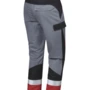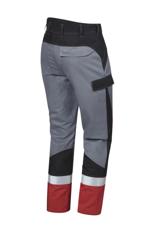 Dreifarbig, erhöhter Rückenbund, verdeckter Patentknopf, Druckknöpfe im Schlitz, seitliche Eingrifftaschen mit Blende und verdecktem Druckkopf, Pattentasche auf linkem Oberschenkel und rechter doppelter Zollstocktasche mit Patte und verdeckten Druckknöpfen, innenliegende Knietaschen mit Kontrasteinsatz oberhalb der rechten und linken Knietasche und kontrastfarbiger Beinabschluss als Erkennungsmerkmal der Sicherheitsstufe „heavy+“, Reflexstreifen unterhalb der Knietaschen, rechte Gesäßtasche mit Patte und verdecktem Druckknopf, 8 Gürtelschlaufen, Vorderhose zweilagig.